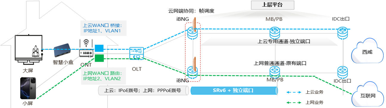 (2) SRv6高速入云通道:通过iBNG智能算力板区分出智慧小盒的入云业务和中小屏的上网业务,将高价值IPv6业务的双向流量承载在SRv6专用通道上,提升用户体验以及业务的运行效率。
