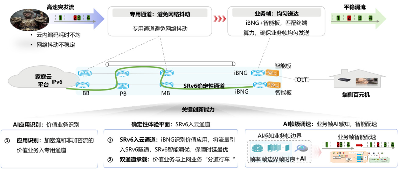 通过在iBNG部署智能单板,精准识别入云与上网业务,基于SRv6构建入云专属通道,实现稳定时延和零抖动的高品质网络转发。针对云服务器视频流不稳定、抖动突出等痛点,基于iBNG智能单板AI能力,准确感知业务帧率、帧边界、帧时序等信息,经iBNG智能板AI调速后的IPv6业务流可智能匹配家庭终端,显著提升普通终端业务体验效果。