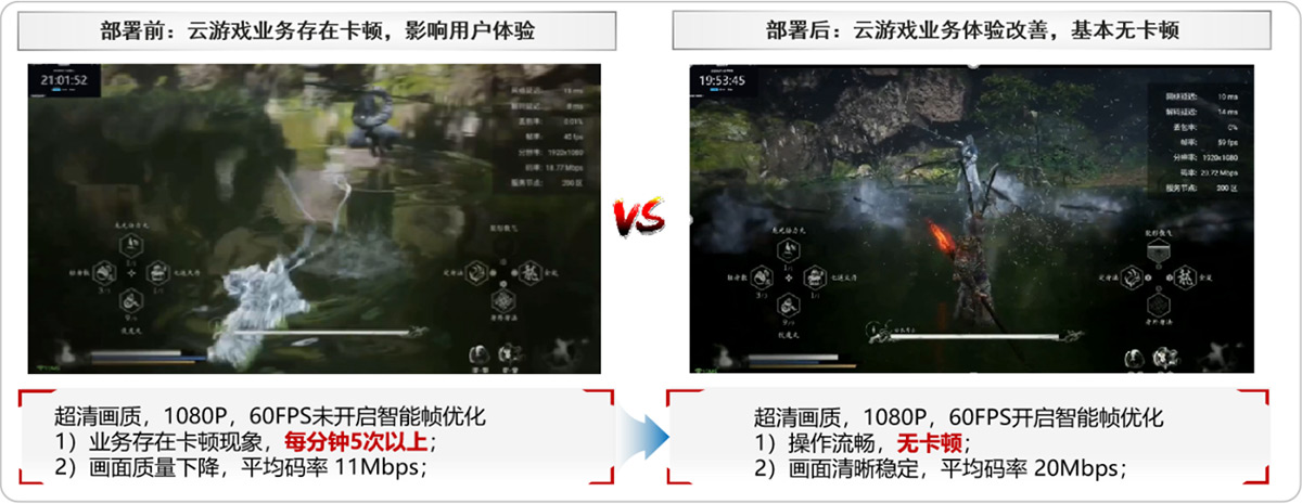 通过算网快舟计划提供的AI WAN解决方案,构建了独立的高速入云平面,提供确定路径、确定性的业务体验。经过测试典型的强交互实时性云主机游戏在方案部署前,一个3分钟40秒的游戏视频,出现10次以上卡顿,视频运行到20秒即出现卡顿,方案部署后,同样游戏的操作视频,没有用户主观感知到的卡顿。