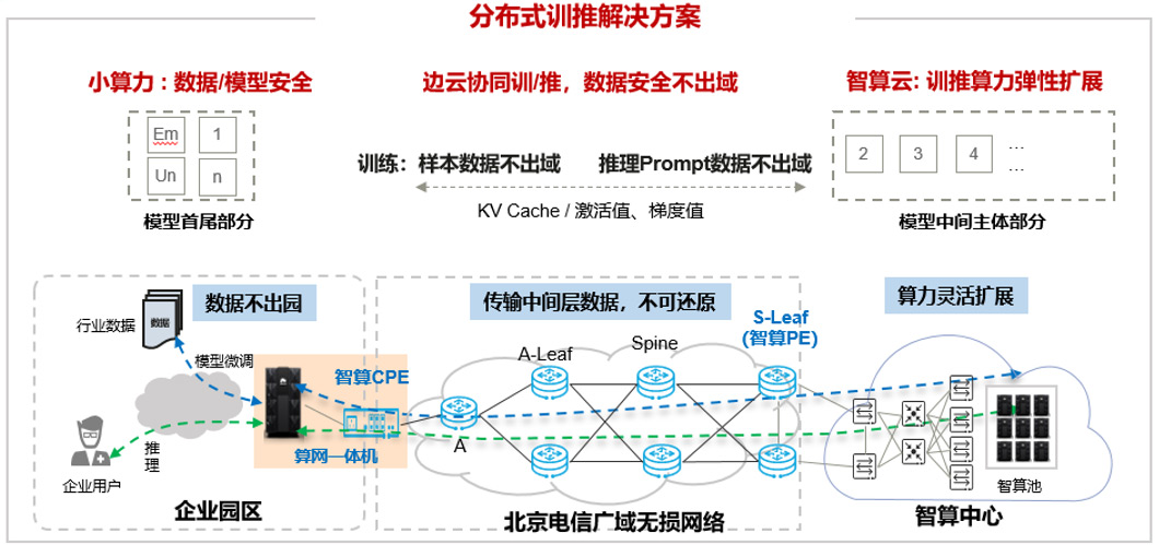 北京电信基于新城完成智算广域网基础设施承载,面对全市高新产业的用算诉求,通过云边协同分布式训推解决方案解决企业用算要求,解决用算企业/行业数据安全不出域、算力灵活扩展、海量数据快速传输等关键需求。方案有几大优势:(1)企业侧轻量化部署,算力扩容快:企业侧只要部署小算力如训推一体机,满足企业AI应用需求,基于业务算力灵活扩容,应对推理/训练算力需求。相比自建智算池综合成本更优。(2)广域RDMA无损网络:高吞吐高弹性的广域无损网络,可提供差异化SLA保障算网一体服务新模式。(3)训推数据安全,通过模型分层部署,云边协同,网络中只传递梯度值保护隐私。