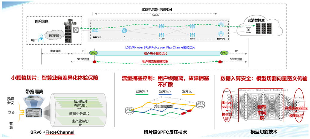 在技术创新方面,融合了IPv6+与AI的前沿新技术,网络通过RDMA无损、SPFC拥塞控制以及量子加密等,配合智算创新将模型分层切割在智算广域网络上只传高维向量,保证原始数据不出域。