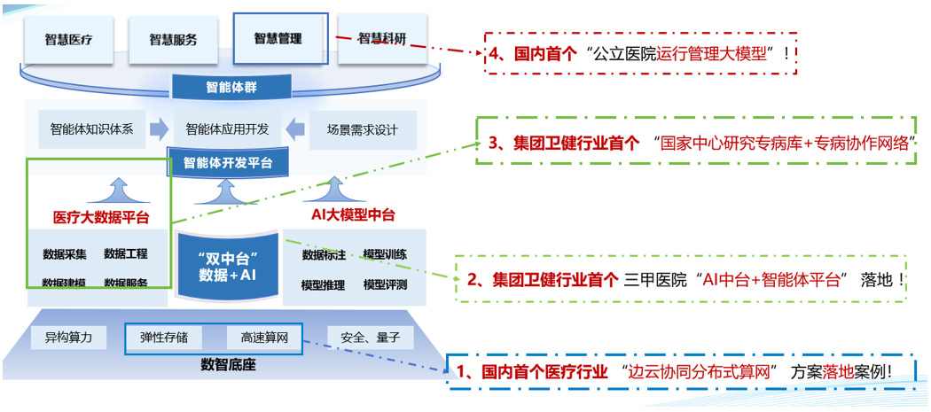 在算力模式创新方面,整合AI中台、网络运力、存储与算力资源,提供算力+网络的一体化服务,实现四个一落地:国内首个医疗行业 "边云协同分布式算网" 方案落地案例!卫健行业首个 三甲医院"AI中台+智能体平台" 落地 ,首个 "国家中心研究专病库+专病协作网络与国内首个"公立医院运行管理大模型" 。向上游延伸激活智能算力、新一代网络等技术创新,向下游拓展形成垂直行业算网一体服务。