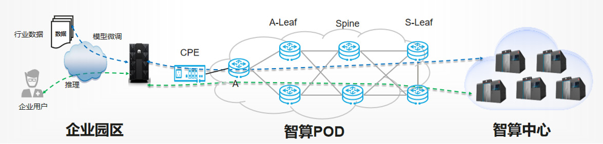 2. 存算分离拉远训练服务,通过智算POD连接企业本地存储和云端算力,实现边训边传,提高模型训练微调效率,数据无需在园区外存储;