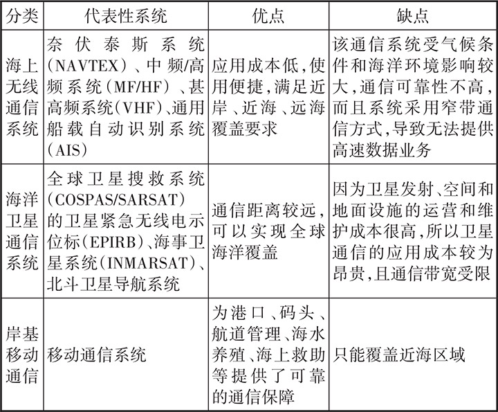 20世纪以来,陆地通信经历了从电缆到光缆、有线到无线、模拟到数字、1G到5G的日新月异的发展变革,而海洋通信的发展明显滞后于陆地通信。目前,我国海洋通信系统包括海上无线通信、海洋卫星通信和岸基移动通信,它们共同构成一个基本实现海洋全覆盖的通信网络。我国海洋通信系统构成情况如表1所示。