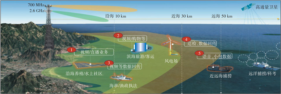 如图1所示,为了适应海洋领域多样化的应用场景和需求,我国电信运营商根据离岸距离、用户类别、业务需求等因素,将海域网络划分为沿海区域(0~10km)、近海区域(30~50 km)和远海区域(50 km以上)3个层次。通过精细化的区域划分和目标设定,优化网络资源配置,提升海洋通信的整体效能,以满足不同海域的特定需求,进而推动智慧海洋战略的深入实施。