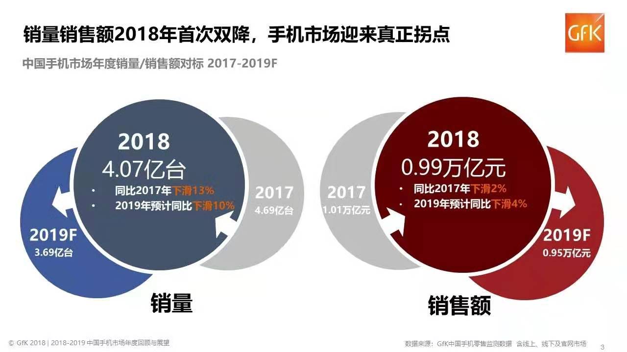 C114讯 3月14日消息(安迪)市场研究机构GfK发布的“中国手机市场2018-2019年度报告”数据显示,2018年中国手机市场销量和销售额首次出现双降:2017年中国手机市场销量4.69亿台;2018年中国手机市场销量4.07亿台,同比下滑13%;2019年中国手机市场销量预计将达3.69亿台,预计同比下滑10%。
