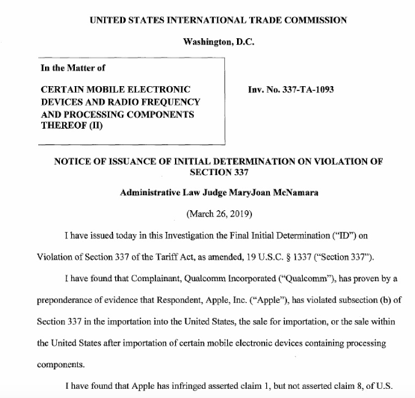 今日,美国国际贸易委员会(ITC)的一名法官裁定,苹果侵犯高通一项专利,并建议对涉及该专利的部分iPhone实施禁令。
