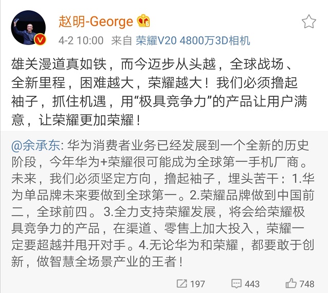 荣耀总裁赵明表示:“雄关漫道真如铁,而今迈步从头越。”在余总的全新战略目标中,荣耀肩负重任:中国前二,全球前四!全球战场、全新里程,困难越大,荣耀越大!我们必须撸起袖子,抓住机遇,用“极具竞争力”的产品让用户满意,让荣耀更加荣耀!