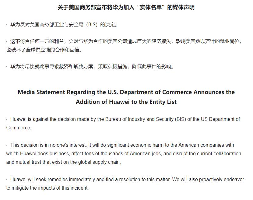 C114讯 5月17日消息(李明)关于美国商务部宣布将华为加入“实体名单”,华为发表媒体声明称:华为反对美国商务部工业与安全局(BIS)的决定,这不符合任何一方的利益,会对与华为合作的美国公司造成巨大的经济损失,影响美国数以万计的就业岗位,也破坏了全球供应链的合作和互信。