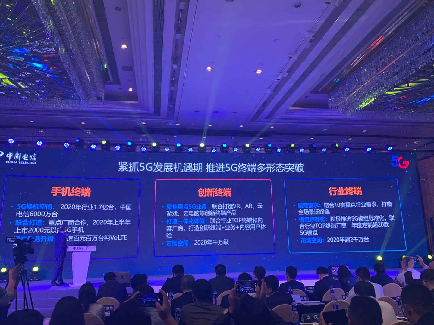 陆良军称,中国电信紧抓5G发展机遇期,推动5G终端多形态突破。数据显示,2020年全行业5G换机空间达到1.7亿台,而中国电信有6000万台。中国电信将联合重点厂商合作,在2020年上半年上市2000元以内的5G手机。同时,中国电信还将打造百元百万台的纯VoLTE手机。