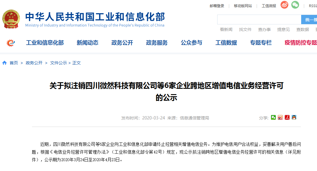 C114讯 3月25日消息(余予)工信部消息显示,为维护电信用户合法权益,妥善解决用户善后问题,就四川微然科技有限公司等6家企业向工信部申请终止其经营相关增值电信业务事件,根据《电信业务经营许可管理办法》(工业和信息化部令第42号)规定,对拟注销跨地区增值电信业务经营许可的相关信息(详见附件)进行公示,公示期为2020年3月24日至2020年4月23日。