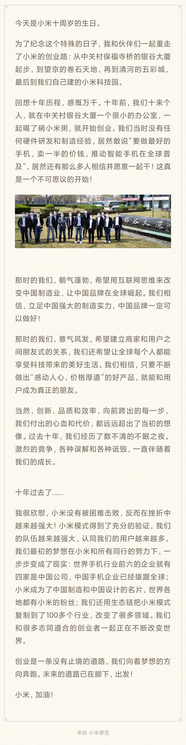 C114讯 4月6日消息(安迪)今天是小米十周岁的生日,为了纪念这个特殊的日子,小米集团创始人、董事长兼CEO雷军和他的伙伴们一起重走了小米的创业路。
