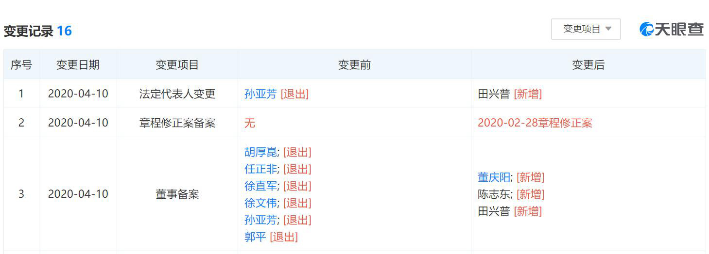 原法定代表人孙亚芳卸任,由田兴普接任。任正非、胡厚崑、徐直军、徐文伟、孙亚芳、郭平卸任董事,新增董庆阳、陈志东、田兴普为董事。