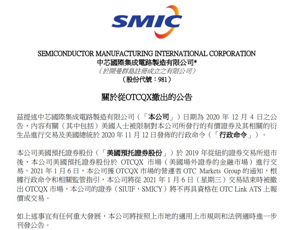 C114讯 1月7日消息(颜翊)中芯国际昨日发布公告称,中芯国际获OTCQX市场(美国场外证券的金融市场)的营运者OTC Markets Group的通知,根据行政命令和相关监管指引,中芯国际将从2021年1月6日交易结束时被撤出 OTCQX 市场,其证券(SIUIF,SMICY)将不再具资格在OTC Link ATS上报价或交易。