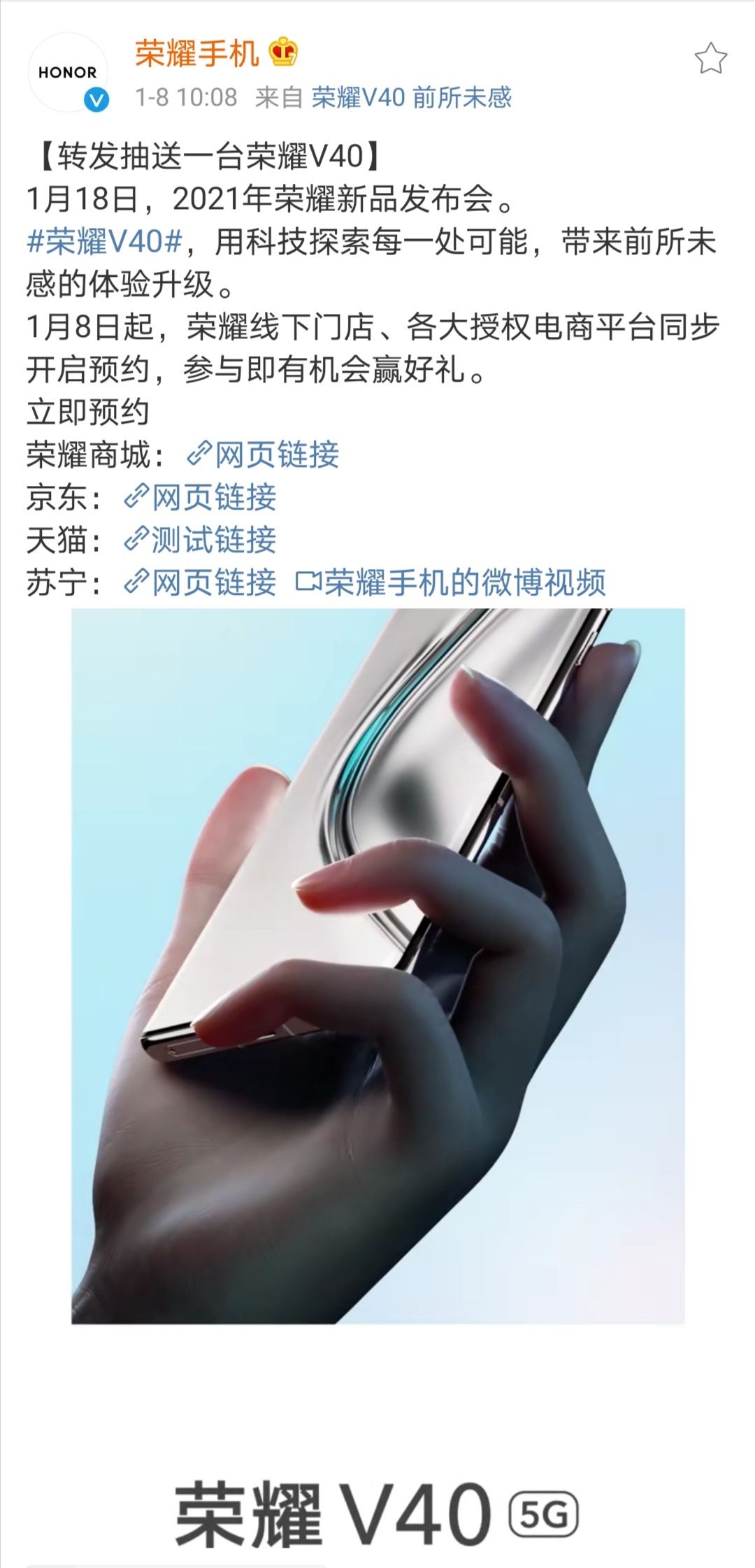 C114讯 1月8日消息(李明)荣耀手机今天通过官微宣布,将于1月18日举行2021年荣耀新品发布会发布新品5G手机荣耀V40。而荣耀V40也将成为荣耀从华为正式剥离后的首款产品。