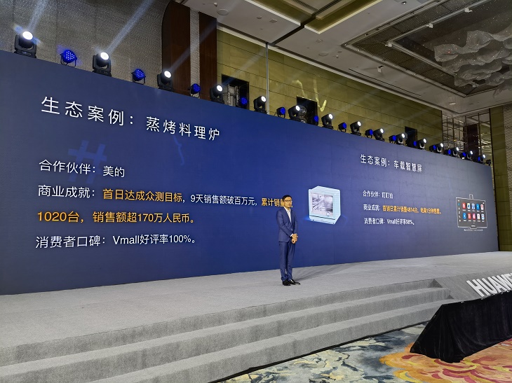 其次是卖好产品,华为将通过线下6万多家零售和服务网点、线上华为商城(Vmall)和华为官方旗舰店等自有零售阵地店,以及1.5万多家三方销售渠道,打通全场景、多路径卖货渠道,给予伙伴全面流量扶持,帮助伙伴卖好产品。据杨海松介绍,当前已有多款HarmonyOS Connect生态产品通过华为销售体系实现销量与口碑的双丰收。以美的蒸烤料理炉为例,其在华为商城众测首日即达成众测目标,9天销售额破百万,累计销售超过1020台,销售额170万元,好评率100%。