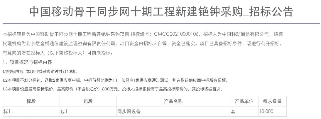 C114讯 5月20日消息(九九)中国移动今日发布骨干同步网十期工程新建铯钟采购招标公告,拟采购铯钟共计10端。