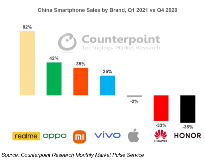 从realme看,作为一个新锐品牌,已经在全球市场积累了足够的厚度,因而回归中国市场时,能够凭借瞄准年轻用户群体的竞争定位和“敢越级”的产品定位,在2020年市场低迷之时取得高速增长,进入2021年市场回暖,增速依然远高于主流品牌。