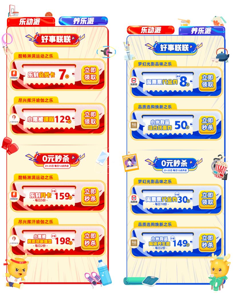 拼手速见证幸运时刻,福利呼之欲出!乐动出击,价值159元乐刻月卡、198元小黑裙精品麂皮瑜伽垫即刻秒杀,带你舒展身体舒缓心情;养乐有招,淘票票30元代金券、价值149元小米有品养生壶0元带走,邀你静下来心感受,岁月静好就此刻!