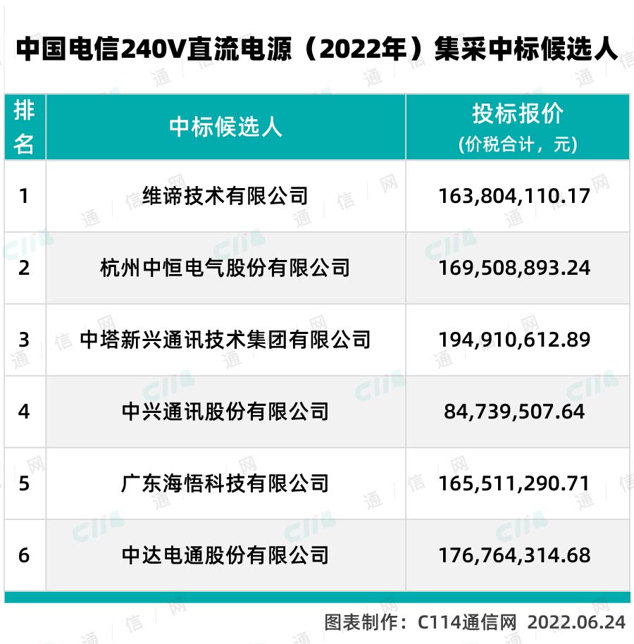 C114讯 6月24日消息(水易)来自中国电信官方消息,中国电信240V直流电源(2022年)集中采购项目评标委员会按照招标文件载明的评标方法和标准已完成对各投标人递交的投标文件的评审。根据评审结果,维谛技术、中恒电气等6家厂商入围。