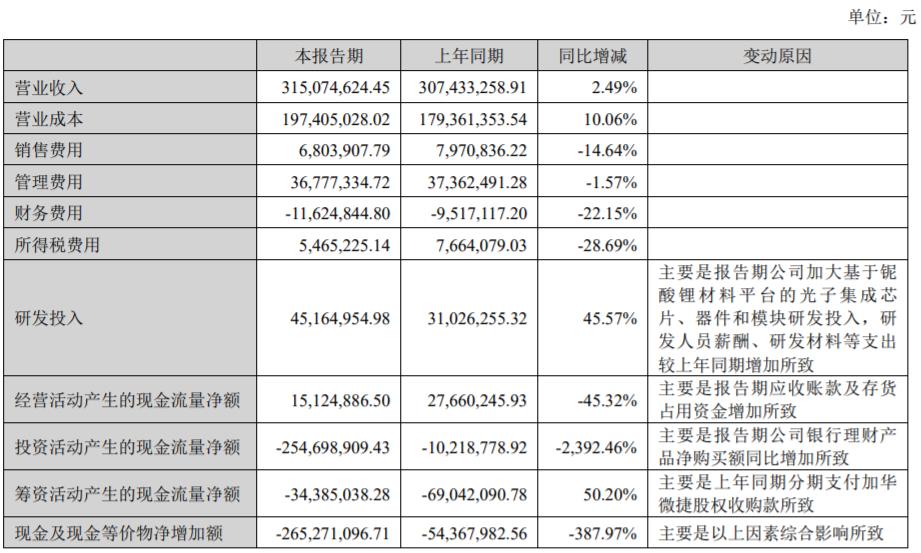 C114讯 8月19日消息(颜翊)光库科技昨日公布了上半年度报告。报告期内,光库科技实现营业收入3.15亿元,较上年同期增长 2.49%,归属于上市公司股东的净利润5791.32万元,较上年同期增长0.56%。