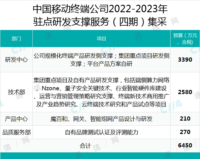据中国移动发布的集采公告显示,本次采购的研发服务主要涉及研发中心、技术部、产品中心和品质服务部。项目总预算6450万元(含税)。