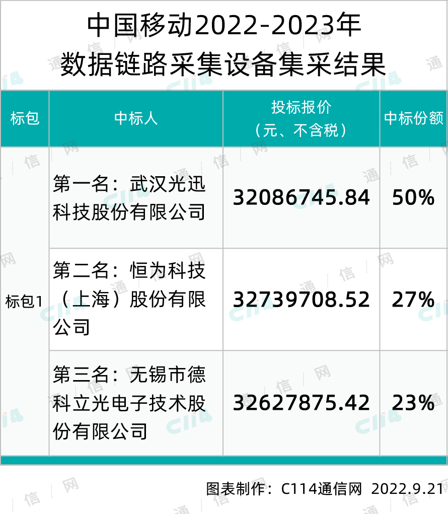 C114讯 9月21日消息(焦焦)从中国移动官网获悉,中国移动昨日公示了2022-2023年数据链路采集设备的集采结果,光迅、恒为、德科立三家中标。