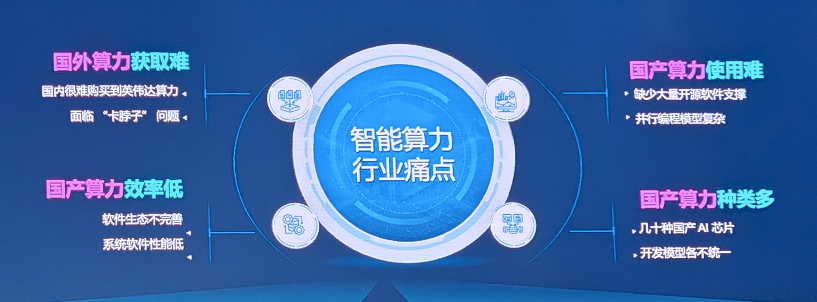 郑纬民进一步指出,我国算力行业当前面临的痛点问题,包括国外算力获取难、国产算力效率低、种类多、使用难的问题。其中智能系统软件是算力性能发挥的主要瓶颈。高昂软件开发成本,以及每家芯片公司都需支持不同模型应用,同时需要大量高端系统软件研发人员。