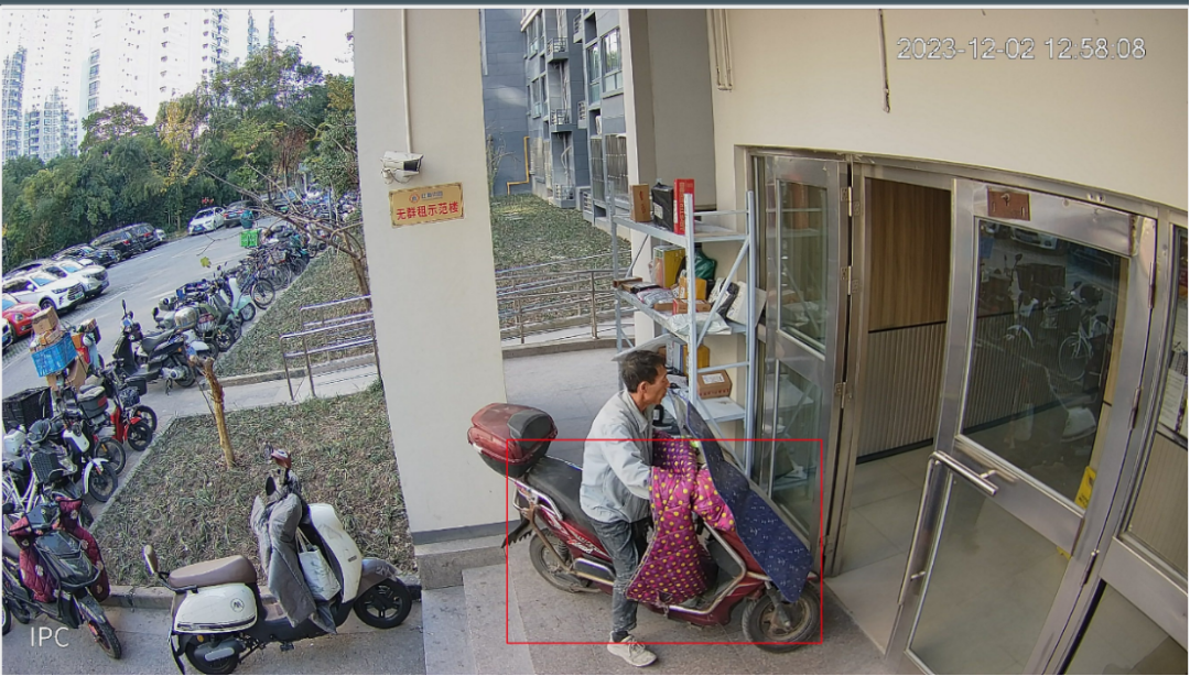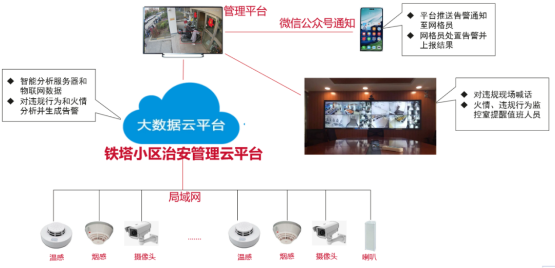 场景一:小区治安监管。通过新建或利旧现有居民生活小区内、单元门口的摄像机,将小区人员、车辆、行为的数据及时采集到云平台。经过AI算法模型的分析和辨别,及时发现电瓶车入楼、消防通道占用、非法停车等违规行为,并可通过喇叭联动对现场进行语音警示;床垫、电冰箱等大件物品搬运识别,推测是否出现群租现象,为物业的运营管理工作插上智慧的“翅膀”,将可能导致火灾隐情的行为及时消灭在萌芽阶段,在提升小区管理效率的同时极大降低安全隐患。同时,铁塔小区管理云平台,还具备烟感、温感等物联设备的接入,在部分场所通过物联网终端的布放,及时将烟雾、温度等异常数据及时上报。多元化的数据采集能力,丰富了小区治理的手段。
