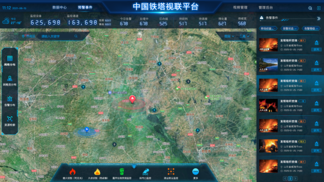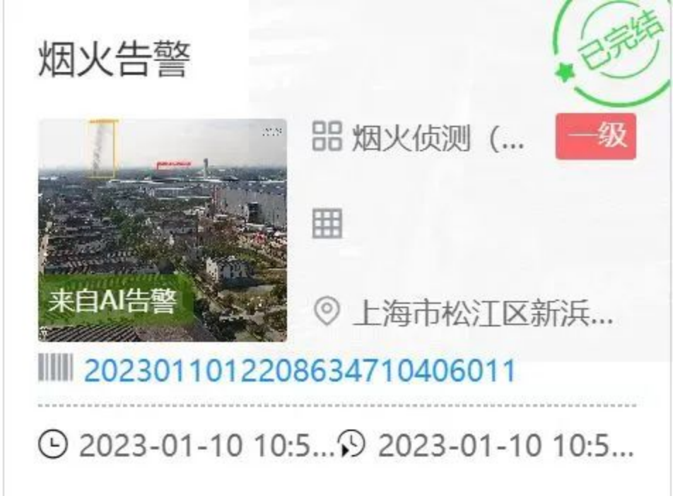 例如:2023年1月,松江新浜城运通过铁塔视联高空点位的烟火告警,成功发现并处理了一件火情。从发现到结束短短30分钟,这起露天火情就实现了从发现到处置的闭环管理。因发现及时、扑救迅速,火情未波及附近树木,危害被降到了最小。