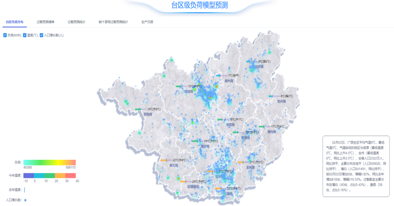 在今年寒潮与春运大规模人群返乡期间,该模型首次应用于实际场景,落地全广西约20万个公变变压器设备,实现了省、市、县三个层级的人口流动、气象变化与负荷变化实时匹配,为超400万返乡人群进行合理电力资源调配,确保电力供应绿色、智能、高效。