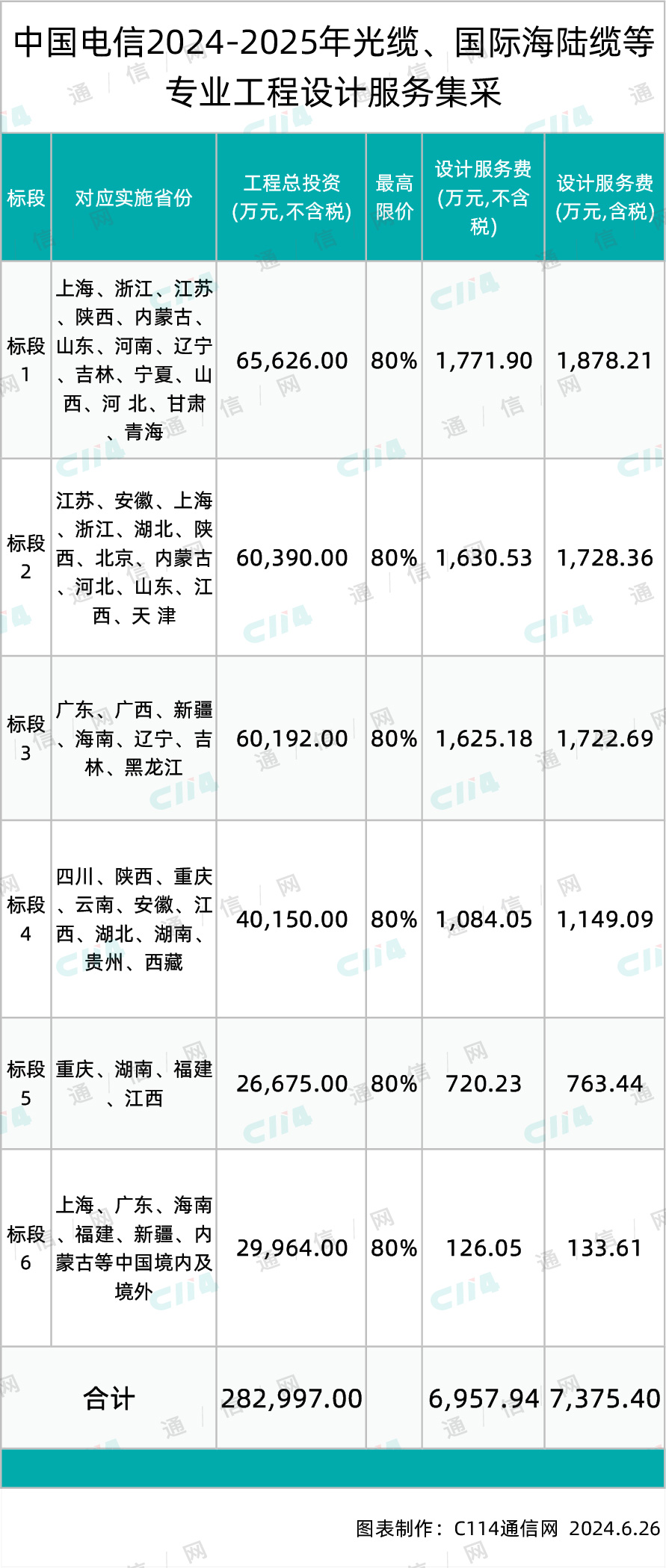该项目工程总预算282,997.00万元(不含税),设计服务费6,957.94万元(不含税)。项目共划分为6个标段,其中标段1-5为光缆可研+设计,标段6为海陆缆可研+设计,具体划分如下: