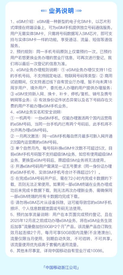 值得注意的是,中国移动还表示,eSIM业务商用试验期间仅支持通过线下自由营业厅办理,用户需到营业厅进行预约登记,暂不支持委托代办、线上办理及境外用户申请。