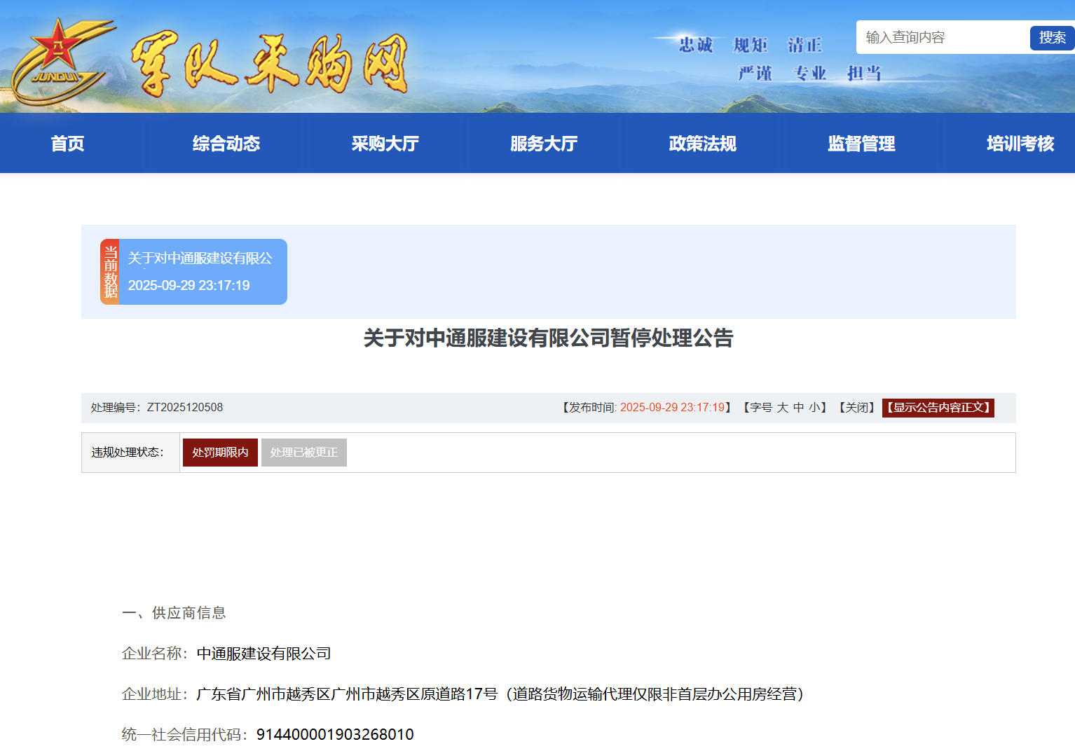 C114讯 10月14日消息(颜翊)近日,军采网发布了《关于对中通服建设有限公司暂停处理公告》。