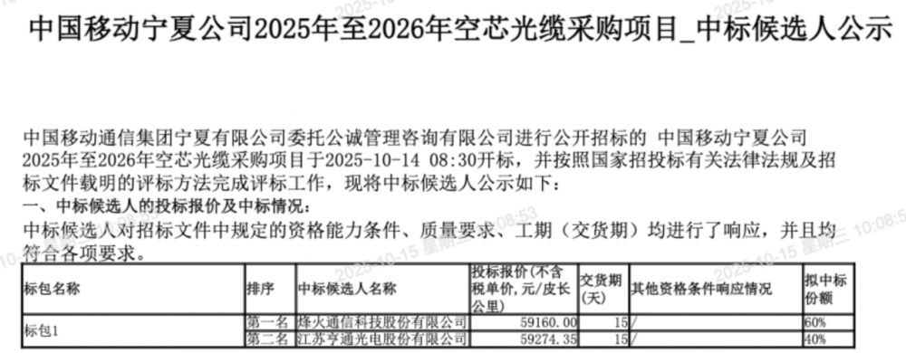 C114讯 10月15日消息(九九)中国移动采购与招标网日前发布宁夏公司2025年至2026年空芯光缆采购项目中标候选人公示,烽火、亨通中标。