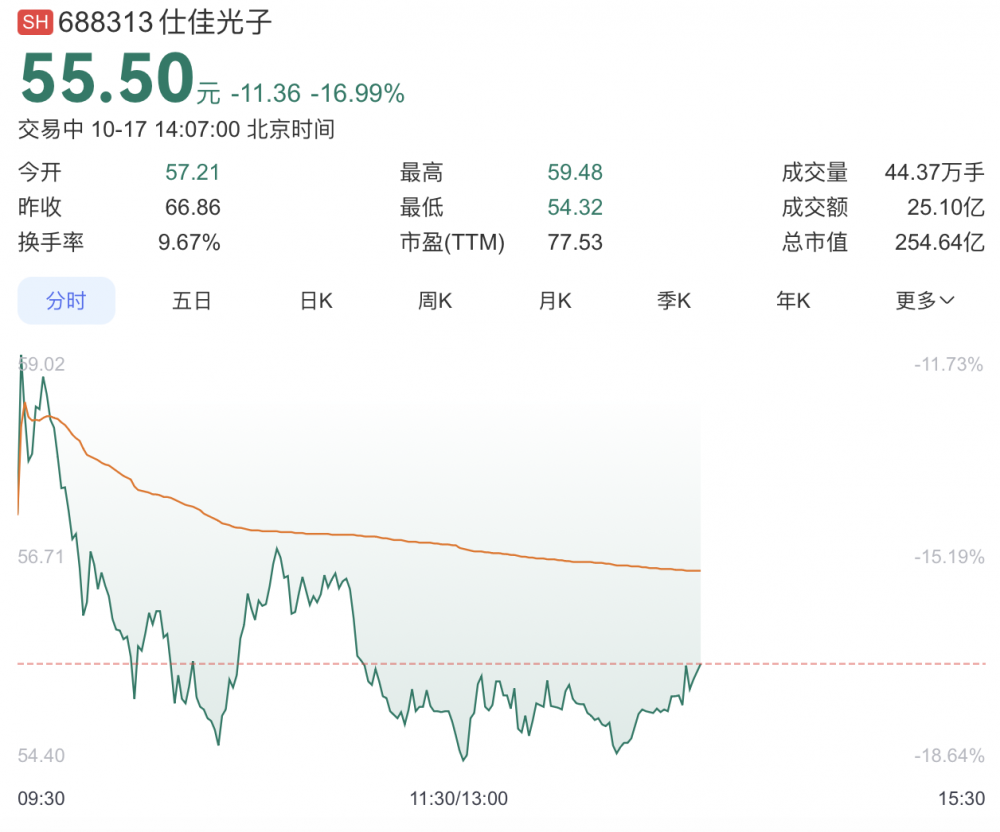 受此影响,仕佳光子股价大跌。截止发稿,仕佳光子股价下跌16.99%。
