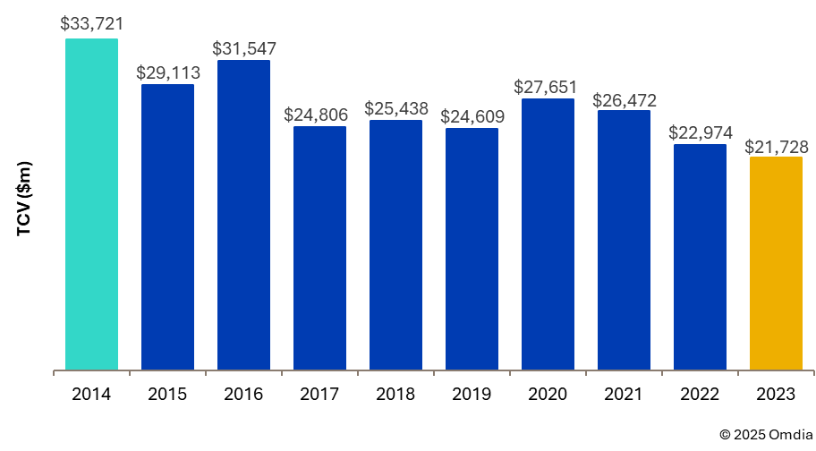 图1:2014-2023年电信B2B前1000项交易的总合同价值(TCV)。