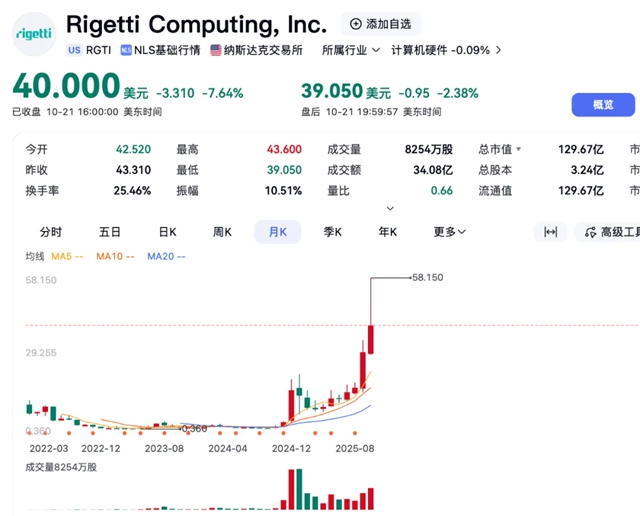 Rigetti Computing在过去一年的股价涨幅约3152%,最高涨幅约3700%,最新市值129.67亿美元。