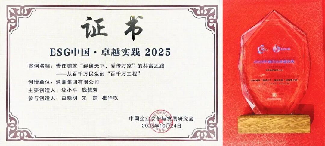 在《2025年度ESG卓越实践报告》发布环节,通鼎集团凭借《责任铺就“缆通天下、爱传万家”的共富之路——从百千万民生到“百千万工程”》实践案例成功入选,该案例展现了通鼎在民生基础设施与公益融合方面的系统贡献,标志着集团在ESG与社会价值共创方面的实践获得行业高度认可。