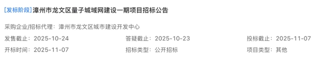 C114讯 11月3日消息(南山)福建中卓工程咨询有限公司受漳州市龙文区城市建设开发中心委托,对漳州市龙文区量子城域网建设一期项目的下述内容进行国内公开招标,现欢迎国内合格的投标人前来参加。