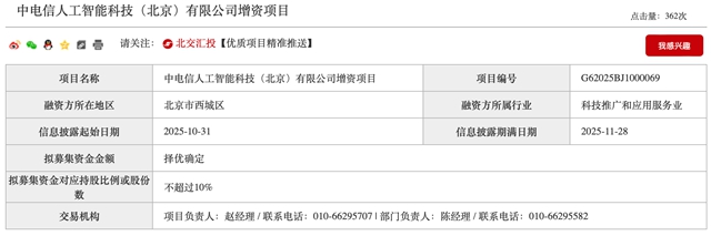 中电信人工智能科技(北京)有限公司拟实施增资,并通过北京产权交易所发布增资信息,择优选定投资方。公告显示,拟募集资金对应持股比例或股份数不超过10%,拟征集投资方数量不超过7个。