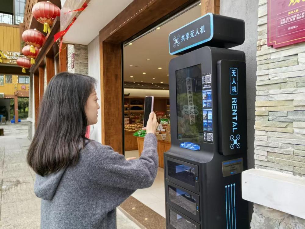 在绵阳北川石椅村农产品交易中心外,游客只需像租用充电宝一样现场扫码,即可轻松租用共享无人机进行自主操控拍摄。现场标识牌显示,无人机体验价只要18.8元/小时,9.9元/半小时。
