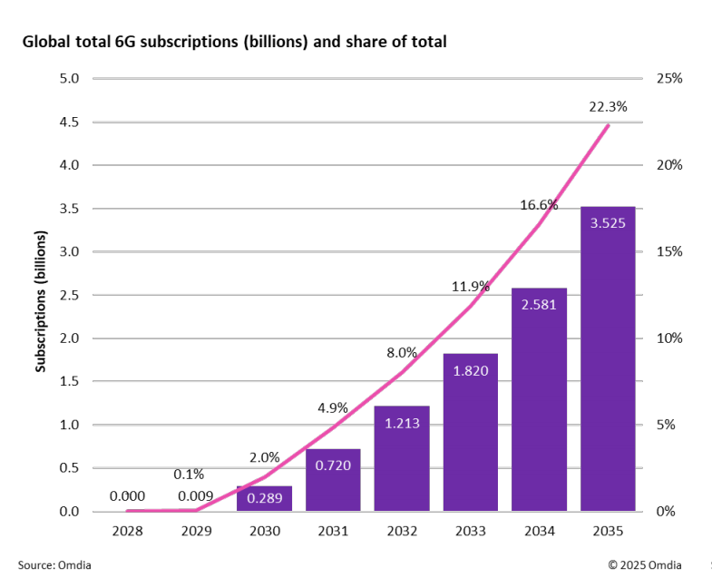 图:全球6G用户总数预测。资料来源:Omdia。