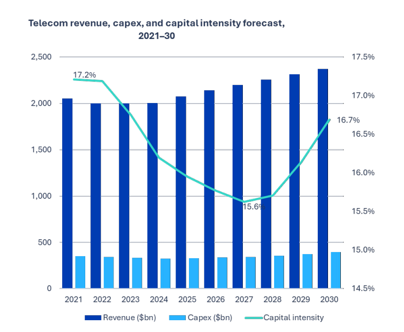 图:2021-2030年期间电信业收入、资本开支和资本密集度预测。资料来源:Omdia。