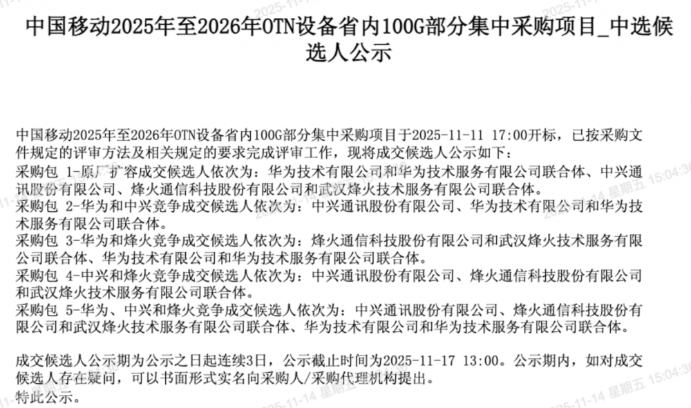 C114讯11月14日消息(九九)中国移动采购与招标网今日发布2025年至2026年OTN设备省内100G部分集中采购项目中选候选人公示,华为、中兴、烽火中标。
