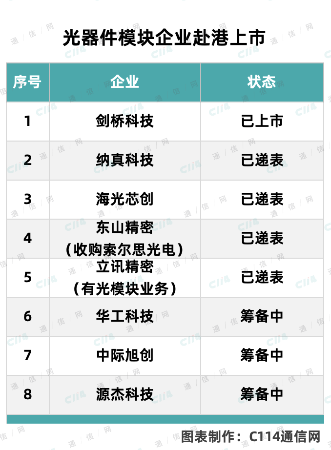 据不完全统计,今年已经在H股上市,或是已经递交申请材料,还是正在筹划中的企业中,有国内光芯片龙头源杰科技,有全球光模块龙头中际旭创,还有纳真科技(海信宽带)、华工科技、剑桥科技、东山精密(已收购索尔思光电)等知名企业,呈现出鲜明的行业龙头引领的局面。