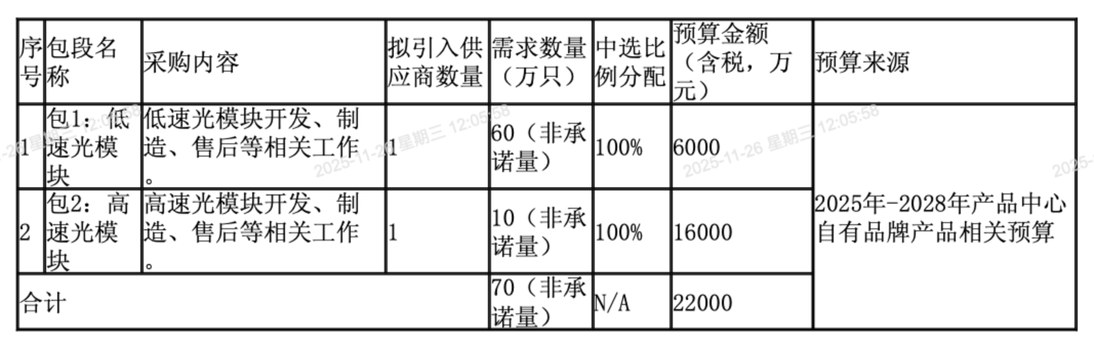 公告显示,中国移动终端公司计划采购70万只光模块。其中低速光模块60万只,预算金额6000万元(含税,下同);高速光模块10万只,预算金额1.6亿元。项目周期3年,总预算金额为2.2亿元。