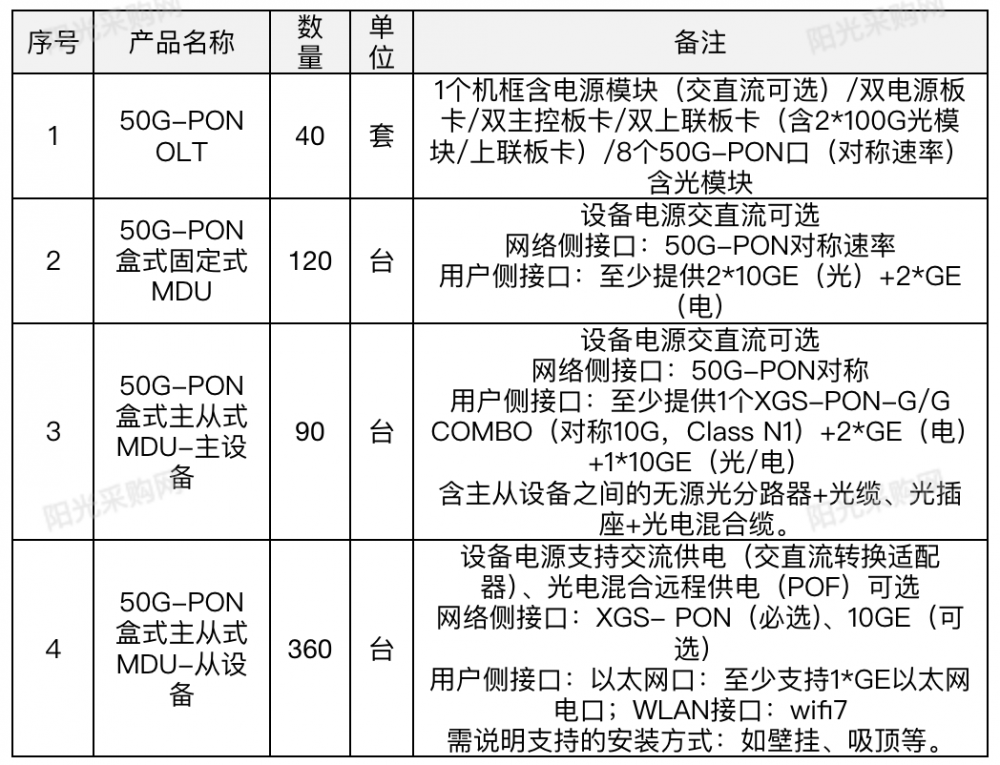 另外,本项目设置最高投标限价为10391700元(不含税),其中50G-PON OLT最高单项投标限价为156000(套/不含税,元),50G-PON盒式固定式MDU最高单项投标限价为17520(台/不含税,元),50G-PON盒式主从式MDU-主设备最高单项投标限价为11910(台/不含税,元),50G-PON盒式主从式MDU-从设备最高单项投标限价为2715(台/不含税,元)。