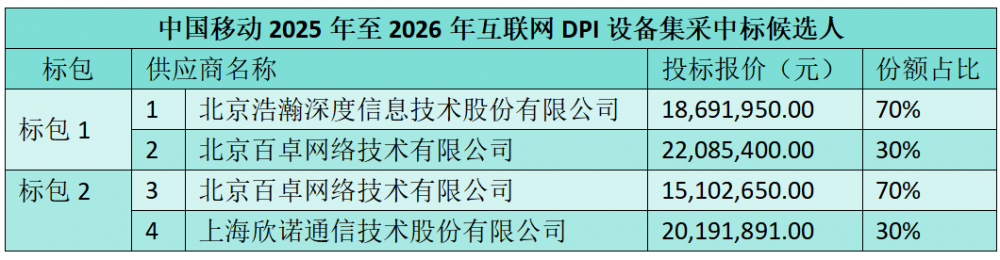 C114讯 12月8日消息(九九)中国移动采购与招标网日前发布2025年至2026年互联网DPI设备(公开招标部分)集中采购项目中标候选人公示,百卓网络等三家中标。
