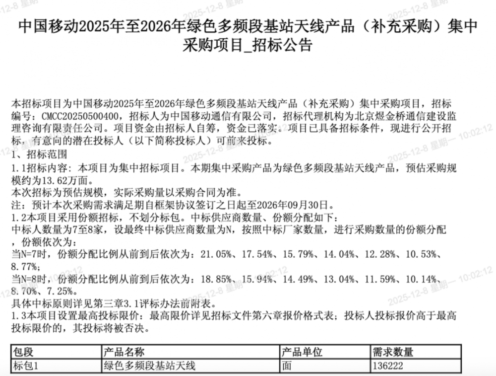 C114讯 12月8日消息(九九)中国移动采购与招标网日前发布2025年至2026年绿色多频段基站天线产品(补充采购)集中采购项目招标公告,预估采购规模为13.62万面。